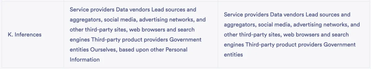 which are drawn from the other categories of Personal Information to construct a profile about a consumer's preferences, interests, characteristics, predispositions, behavior, attitudes, intelligence, abilities, and aptitudes.