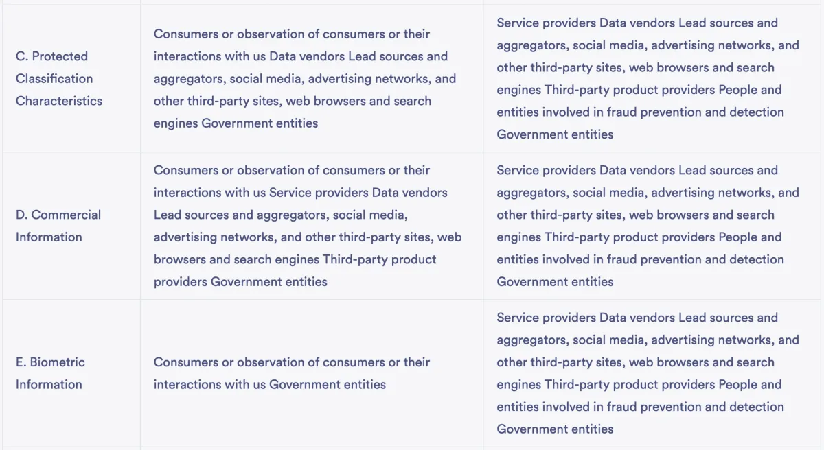 We may collect some or all of the following categories of Personal Information about California consumers: