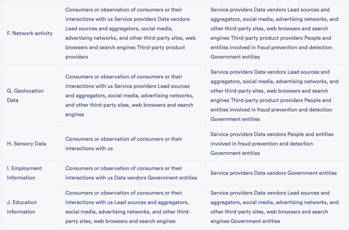 Category F:Internet or Other Electronic Network Activity Information (“Network Activity”), such as website information, browsing history, search history, or information relating to consumer’s interaction with an internet website, application, or advertisement.